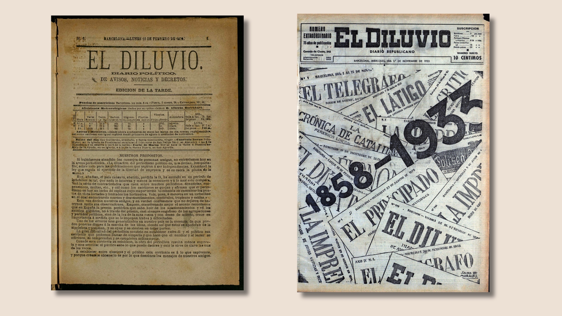 A l’esquerra, la primera edició del diari ‘El Diluvio’. A la dreta, la portada del número especial commemoratiu del 75è aniversari. Font: Arxiu de Revistes Catalanes Antigues (ARCA).